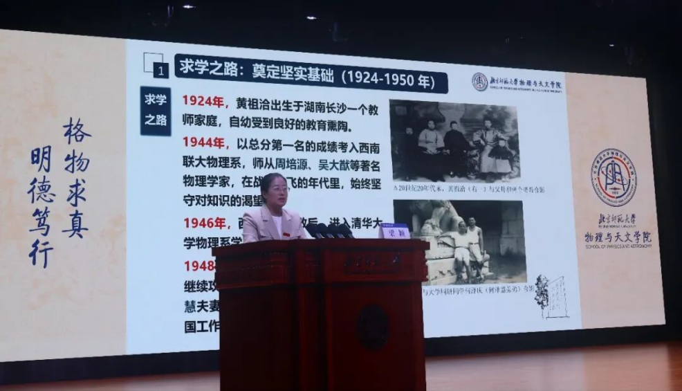 9月15日,物理与天文学院党委书记、关工委主任梁颖以“弘扬教育家科学家精神,汲取奋进力量”为题,深情讲述了已故老教师黄祖洽院士的光辉一生。梁颖老师回顾了黄先生作为中国核武器理论奠基人之一,隐姓埋名、无私奉献的“两弹”功勋岁月,以及他晚年调入北师大,甘为人梯、培养人才的“杏坛师者”风范。黄祖洽先生身上集中体现的爱国、创新、求实、奉献、育人精神,为全体新生和新教师树立了光辉榜样,激励大家将个人奋斗融入国家科技强国建设的大局。