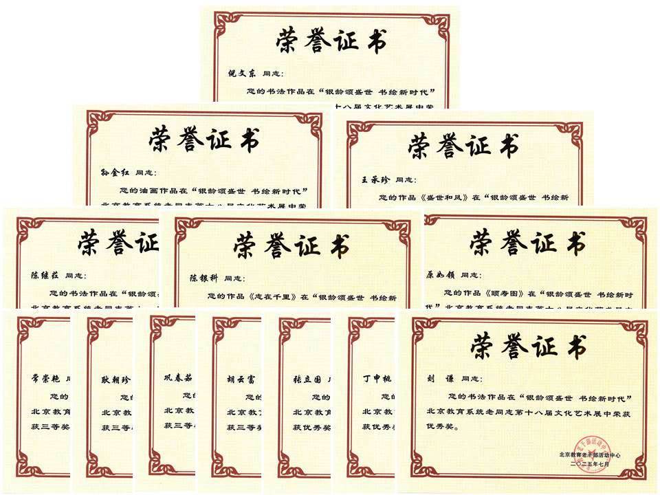 本次会议还给参加“2025年北京教育系统老同志第十八届文化艺术展”的优秀作品进行了颁奖,我校共有13位老同志的13幅作品获奖。