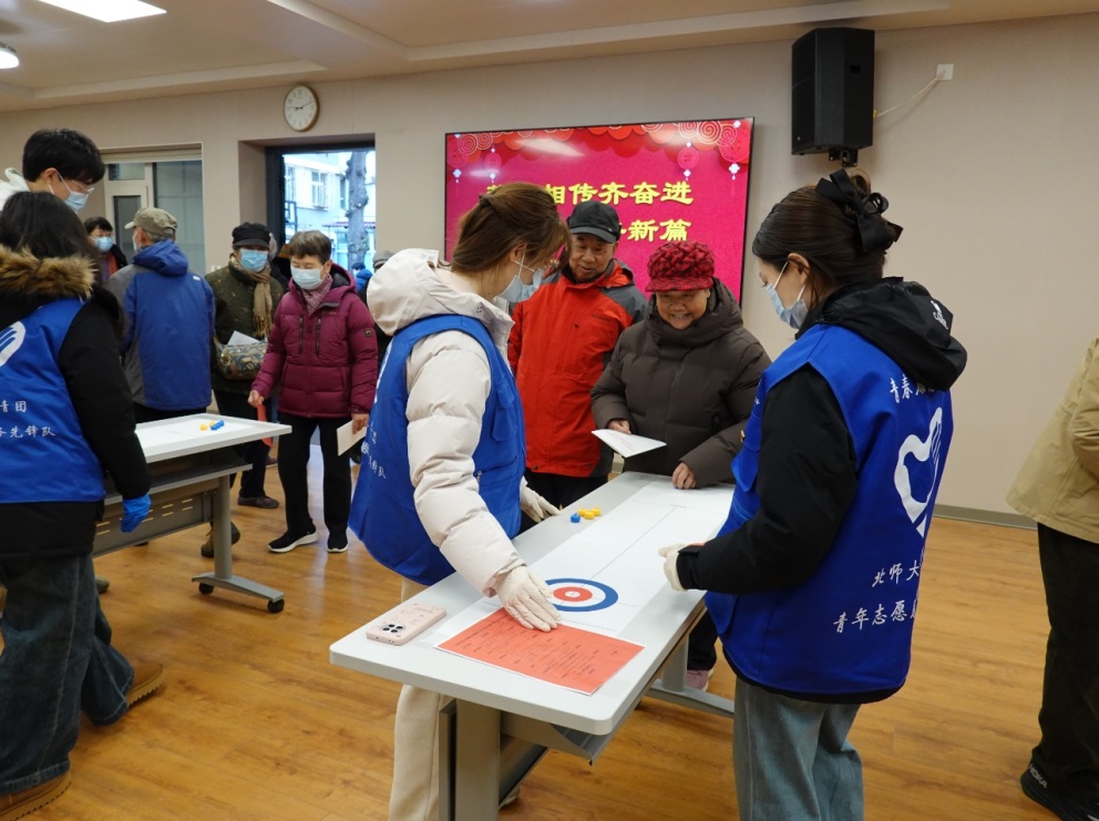 游艺会开始前,老同志们领取了党委组织部和离退休工作处发放的《中国共产党第二十届中央委员会第四次全体会议公报》,积极进行学习。游艺会设置了推冰壶球、钓鱼、猜谜语、调棋子、拼图、动物连线、双棒夹球等多项趣味活动。现场气氛热烈、其乐融融,老同志们精神饱满,在各学部院系学生志愿者的热情引导与协助下,有序体验各项游戏。志愿者们耐心陪伴、贴心服务,悉心协助高龄老同志参与活动,展现出良好的精神风貌与敬老情怀。在老少齐心、通力协作下,大家完成了一个个游艺任务,收获了相应的节日礼品。